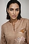 Featuring a beige straight-cut kurta in silk chanderi base with lace-up neckline and japanese wave motifs. It is paired with trousers. Style with pearl jewelry, soft waves, and neutral heels, perfect for brunches, intimate gatherings and festive occasions.