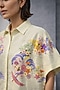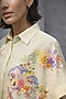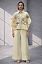 Featuring a butter yellow cape-style shirt in silk chanderi base with a classic collar, japanese wave motifs and floral embroidery. It is paired with wide-leg trousers. Style with pearl jewelry, soft waves, and neutral heels, perfect for brunches, cultural events, or office wear.