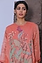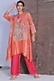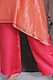 Featuring a geranium pink A-line kurta in handloom linen silk base with applique work. It is paired with contrasting fluorescent pink handloom tissue silk pants.