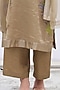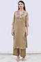 Featuring a pale brown kurta in handloom tissue silk base with applique work. It is paired with matching linen satin pants and a stole.