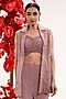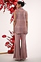 Featuring a champagne jacket in organza and georgette base, adorned with hand embroidery and thread detailing. It is paired with a flared sharara and an embroidered blouse. Accentuate it with polki jewellery and wedges for cocktail evenings or a wedding ceremony.