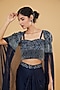 Featuring a navy blue blouse in satin and silk base with cutdana hand embroidery. It is paired with a skirt and a satin organza cape. Accentuate it with statement earrings and heels for sangeet or wedding ceremonies.