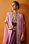 Featuring a purple and pink ombre cape in satin modal, silk and organza base with hand embroidery. It is paired with an embroidered crop top and a draped skirt. Accentuate it with statement jewellery and heels for a wedding or engagement ceremony.