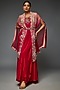 Featuring a red and pink ombre cape in georgette base with embroidery. It is paired with a matching red anarkali and a belt.