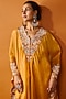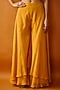 Featuring a yellow triangle cape in organza and viscose organza base with embroidery. It is paired with a blouse and satin organza layered sharara pants. Accentuate it with statement jewellery and heels for a festive occasion or haldi ceremony.