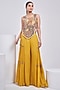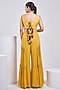 Featuring a yellow sharara in silk and georgette base. It is paired with an embroidered backless corset. Accentuate it with polki jewellery and wedges for haldi moments, sangeet ceremony, or any other day that calls for sparkle and swing.