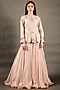 Featuring a blush pink peplum top in cupro raw silk base with floral motifs and jaal hand embroidery. It is paired with a matching flared skirt in viscose satin organza base.