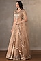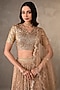 Featuring a beige lehenga in organza shimmer base with embroidery. It is paired with a blouse having badla, moti and cheed work, including a floral embroidered dupatta. Accentuate it with gold earrings and block heels for a wedding or sangeet ceremony.