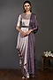 Featuring a beige gown in satin base with print. It is paired with a contrasting purple dupatta and an embroidered belt.