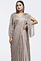 Featuring a beige pre-stitched saree in satin base with embellished edges. It is paired with a blouse having short cape sleeves, beads and sequins embellishment. Style it with dangler earrings and heels for a festive occasion, cocktail, wedding or sangeet ceremony.