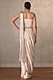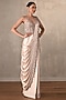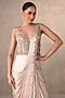 Featuring a beige pre-draped gown saree in satin base with a corset bodice, sequins and beads embroidery. Style it with statement earrings, bold heels and a metallic clutch for a striking edge, Perfect for a cocktail, sangeet or engagement parties.