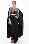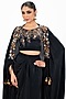 Featuring a black cape in crepe base with embellishments. It is paired with a bustier and a draped skirt. Accentuate it with kundan polki earrings and heels for festive occasions or sangeet ceremony.
