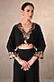 Featuring a black crop top in georgette base with mirror and thread embellishments, including a V-neckline. It is paired with wide-legged pants. Accentuate it with pearl earrings and block heels for a festive look.