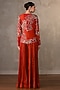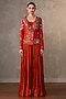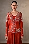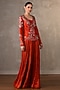 Featuring a brick red jacket in silk base with print, sequins and cutdana embellishment. It is paired with a bustier and pleated pants. Accentuate it with silver earrings and block heels for a festive occasion or sangeet ceremony.