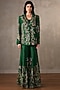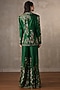 Featuring an emerald green jacket in silk base with embellishments. It is paired with a bustier and embellished pants. Accentuate it with kundan polki earrings and heels for festive occasions or mehendi ceremony.