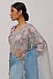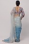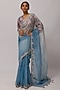 Featuring a grey and blue ombre saree in organza base with mirror, tikki, and resham work. It is paired with a matching blouse having floral print.