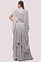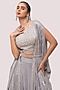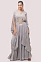 Featuring a grey cape in georgette chikankari base with sequins and cutdana embellishment. It is paired with a matching crop top, georgette wide legged pants, and a belt.