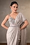 Featuring a grey gown saree in satin base with sequins, mirror and cheed work, including a single shoulder drape detail. Accentuate it with dangler earrings and block heels for cocktail nights or sangeet ceremonies.
