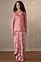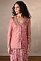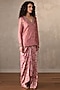 Featuring a light magenta jacket in tissue base. It is paired with a bustier and a banarasi draped skirt. Accentuate it with zircon earrings and heels for festive occasions or sangeet ceremony.