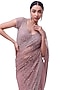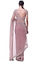 Featuring a mauve saree in net base with stone and sequins embellishments. It is paired with an embellished blouse having cap sleeves. Style it with ethnic dangler earrings and block heels for a festive occasion or pre-wedding ceremonies.