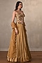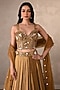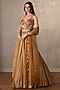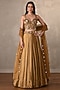 Featuring a mehendi green kalidar lehenga in satin base. It is paired with a sleeveless blouse having a sweetheart neckline and mirror embellishments, including a dupatta. Style it with statement earrings, bold heels and a metallic clutch for a striking edge, Perfect for a wedding, sangeet or engagement parties.