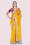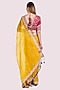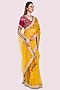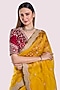 Featuring a mustard saree in organza base with floral embroidery. It is paired with a blouse having zari, dabka, cutdana and tikki embellishments. Style it with statement earrings, bold heels and a metallic clutch for a striking edge, Perfect for a cocktail, sangeet or engagement parties.