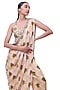Featuring a mustard strappy crop top in satin base with geometric print, cutdana and sequin embellishments. It is paired with wide-leg pants and a draped dupatta. Perfect for a sangeet or festive ceremony.