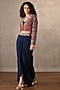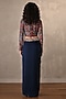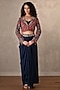 Featuring a navy blue jacket in silk base with mirror embellishments. It is paired with an embroidered bustier and a draped skirt. Accentuate it with silver earrings and block heels for a festive occasion or sangeet ceremony.