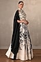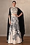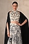 Featuring an off-white lehenga in crepe base with botanical print. It is paired with a blouse and a black cape having having beads embellishments. Style it with statement earrings, bold heels and a metallic clutch for a striking edge, Perfect for a wedding, sangeet or engagement parties.