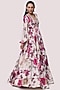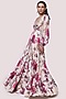 Featuring an off-white gown in satin base with hand-dyed floral print, balloon sleeves, and mirror work.