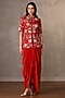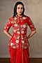 Featuring a red peplum-style top in silk base with a mandarin collar, thread, pearls and sequins embroidery. It is paired with a crepe draped skirt. Accentuate it with polki earrings and block heels for a festive occasion or sangeet ceremony.