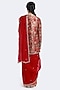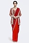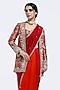 Featuring a red-orange saree in organza base with kasab and sequin embellishments. It is paired with a bustier blouse and an embellished front-open jacket. Accentuate it with statement earrings and heels for a festive occasion, wedding or engagement ceremony.