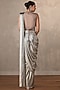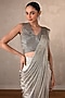 Featuring a silver draped saree in lycra base. It is paired with a blouse having sequins and cutdana embellishment. Accentuate it with gold earrings and block heels for a festive occasion or sangeet ceremony.