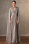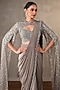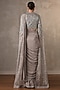 Featuring a steel grey draped saree in heavy crepe base with embroidery. It is paired with a blouse having sequins, beads and cutdana embellishment, including a jacket. Accentuate it with gold earrings and block heels for a festive occasion or sangeet ceremony.