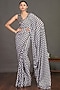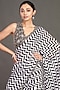 Featuring a white and black saree in satin base with cutdana embroidery and zig zag print. It is paired with a matching blouse and a belt.