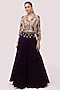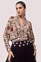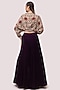 Floral georgette indo-western set. An off-white full sleeve baggy floral printed jacket featuring mirror, thread, sequin and cheed work. It is paired with a wine-pleated skirt with minimal pearl detailings.