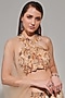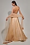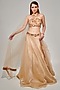 Featuring a beige flared lehenga in metallic fluid organza base with sequins, beads, cutdana embellishments. It is paired with a crepe halter-neck blouse and a tulle dupatta. Style this designer lehenga set with statement jewellery and heels for a sangeet or engagement ceremonies.