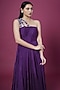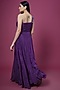 Featuring a lilac flared ruched gown in chinon chiffon base with embellished cross straps.