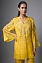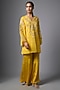 Featuring an amber yellow kurta in silk and organza base with sequins, beads, crystal and floral applique embroidery. It is paired with silk pants and a cotton slip. Accentuate it with dangler earrings and mules for a festive occasion or pooja ceremony.