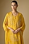 Featuring an amber yellow kaftan in silk base with sequins, beads, crystal and floral hand embroidery. It is paired with silk pants and a cotton slip. Accentuate it with statement jewellery, a potli bag and embroidered heels for a stylish ensemble, ideal for wedding occasions or vibrant festive celebrations.