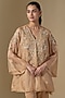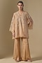 Featuring a beige kurta in silk and organza base with floral applique, sequins, beads, crystal hand and machine embroidery. It is paired with silk pants, including a cotton slip. Accentuate it with statement earrings and heels for festive celebrations or family gatherings.