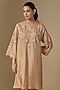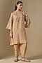 Featuring a beige kurta in silk and organza base with sequins, beads, crystal hand and machine embroidery. It is paired with silk salwar pants, including a silk and cotton slip. Accentuate it with statement earrings and heels for festive celebrations or family gatherings.