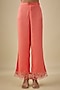 Featuring a coral kurta in silk base with floral applique, crystal, sequins and beads embroidery. It is paired with silk bell bottom pants. Accentuate it with jhumkas and sandals, perfect for a festive lunch, casual celebration or family gathering.