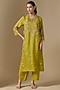 Featuring a henna green kurta in silk and organza base with sequins, beads, crystal hand and machine embroidery. It is paired with silk pants and a cotton slip. Accentuate it with statement earrings and heels for festive celebrations or family gatherings.