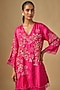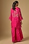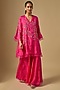 Featuring a hot pink kurta in silk and organza base with sequins, beads, crystal hand and machine embroidery. It is paired with silk sharara pants, including a cotton and silk slip. Accentuate it with statement earrings and heels for festive celebrations or family gatherings.