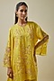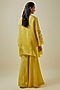 Featuring a mango-colored tunic in silk organza and viscose silk base with floral applique and hand embroidery. It is paired with viscose silk sharara pants and a cotton slip. Accentuate it with statement jewellery and embellished heels for festive occasions or pooja ceremony.