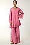 Featuring an orchid pink kurta in silk base with floral thread, sequins and beads embroidery. It is paired with viscose organza pants and a cotton slip. Accentuate it with minimal jewellery and kolhapuri flats for a festive look, family gathering or pooja ceremony.