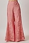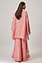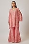 Featuring a peach tunic in silk organza and viscose silk base with floral applique and hand embroidery. It is paired with viscose silk sharara pants and a cotton slip. Accentuate it with statement jewellery and embellished heels for festive occasions or pooja ceremony.