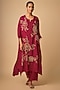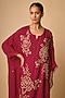 Featuring a ruby red kaftan in silk base with crystal, beads and sequins hand embroidery. It is paired with a cotton slip and pants. Accentuate it with statement jewellery and heels for a festive occasion, cultural event or sangeet ceremony.