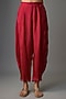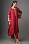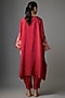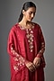 Featuring a ruby kurta in silk and organza base with sequins, beads and floral applique hand embroidery. It is paired with silk pants and cotton slip. Accentuate it with dangler earrings and heels for a festive occasion pooja ceremony.